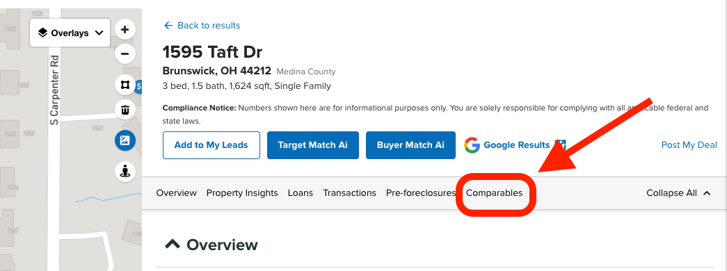 Option B will take you to the Leadpipes list view, which will allow you to refine your list further. When you find a specific property you would like to run comps on, CLICK on the specific property address and you will be directed to the Property overview page that will include additional details on the property.