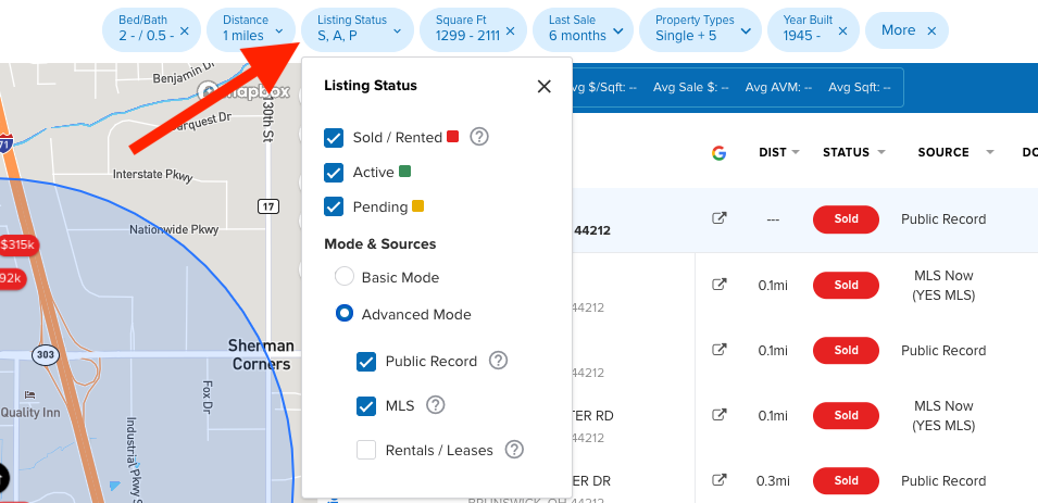 3. Listing Status - Identify if you would like the comps to be Sold, Active, Pending, as well as the Source of the comps, MLS vs Public. Select 'Advanced Mode' to select the Source of the Comps