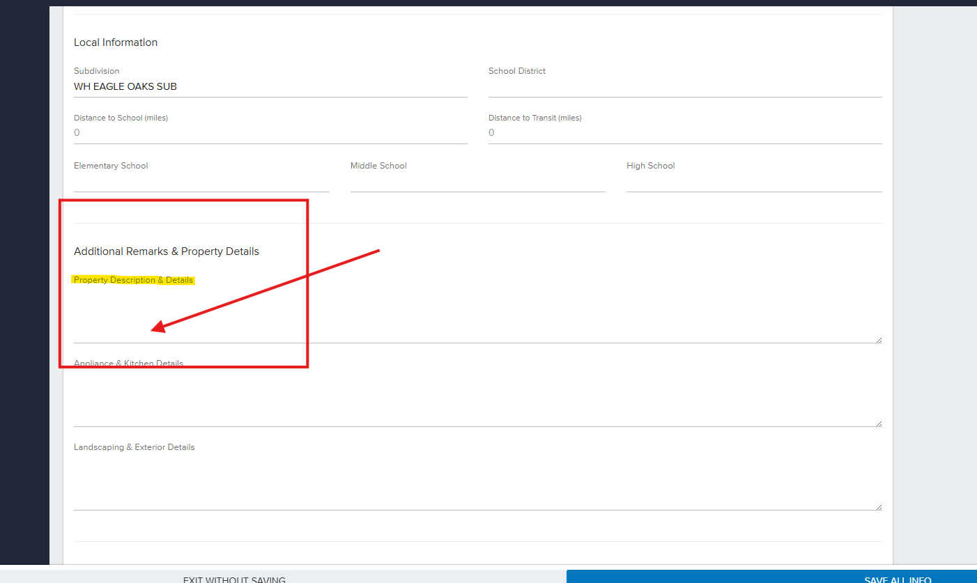 Complete the Property Description & Details field within the 'Additional Remarks & Property Details section