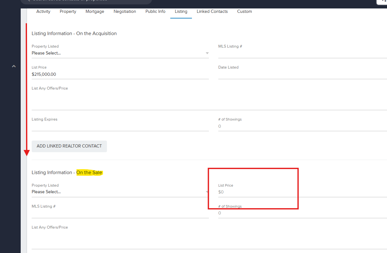 Enter the LISTING Price in the ON THE SALE section & 'SAVE ALL INFO'